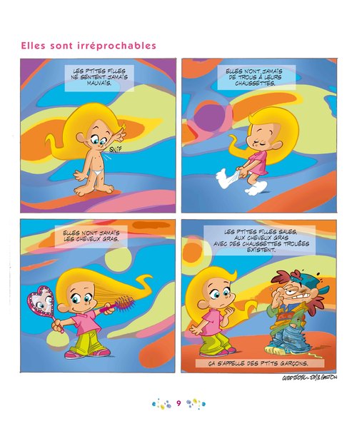 Les petites filles sont des princesses. Elles sont précieuses, délicates, et puis si fragiles. Elles ont droit à tous les égards. Les princesses n’ont pas de défauts : elles ne sont pas capricieuses, pas boudeuses, pas chipies, et ne manipulent jamais leurs parents. Même si elles ne se lavaient jamais, elles resteraient propres. Les petits garçons ne sont pas des princes charmants, ce sont leurs valets… et le pire, dans tout ça, c’est qu’elles le savent déjà.